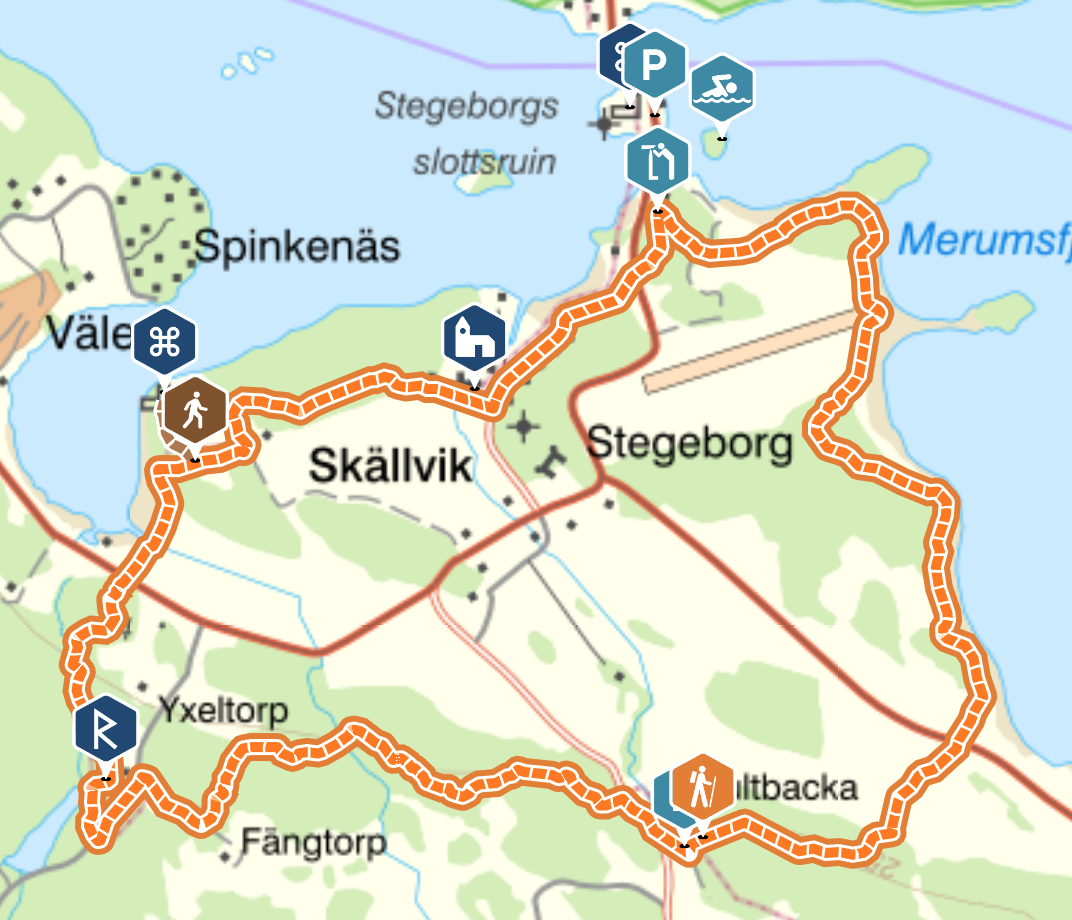 Leden är mycket varierad och bitvis kan den vara krävande med branta backar. Långa sträckor vandrar du i vackra hagmarker vilka hyser stora naturvärden med bland annat gamla och grova ekar. På en bergshöjd strax söder om Stegeborgs hamn kommer du fram till en utsiktsplats med läckra vyer mot Slätbaken och slottsruinen. Stegeborgsslingan är en markerad rundslinga till Östgötaleden. Följ orange markering. Rör dig lugnt bland betesdjuren och håll hunden kopplad.